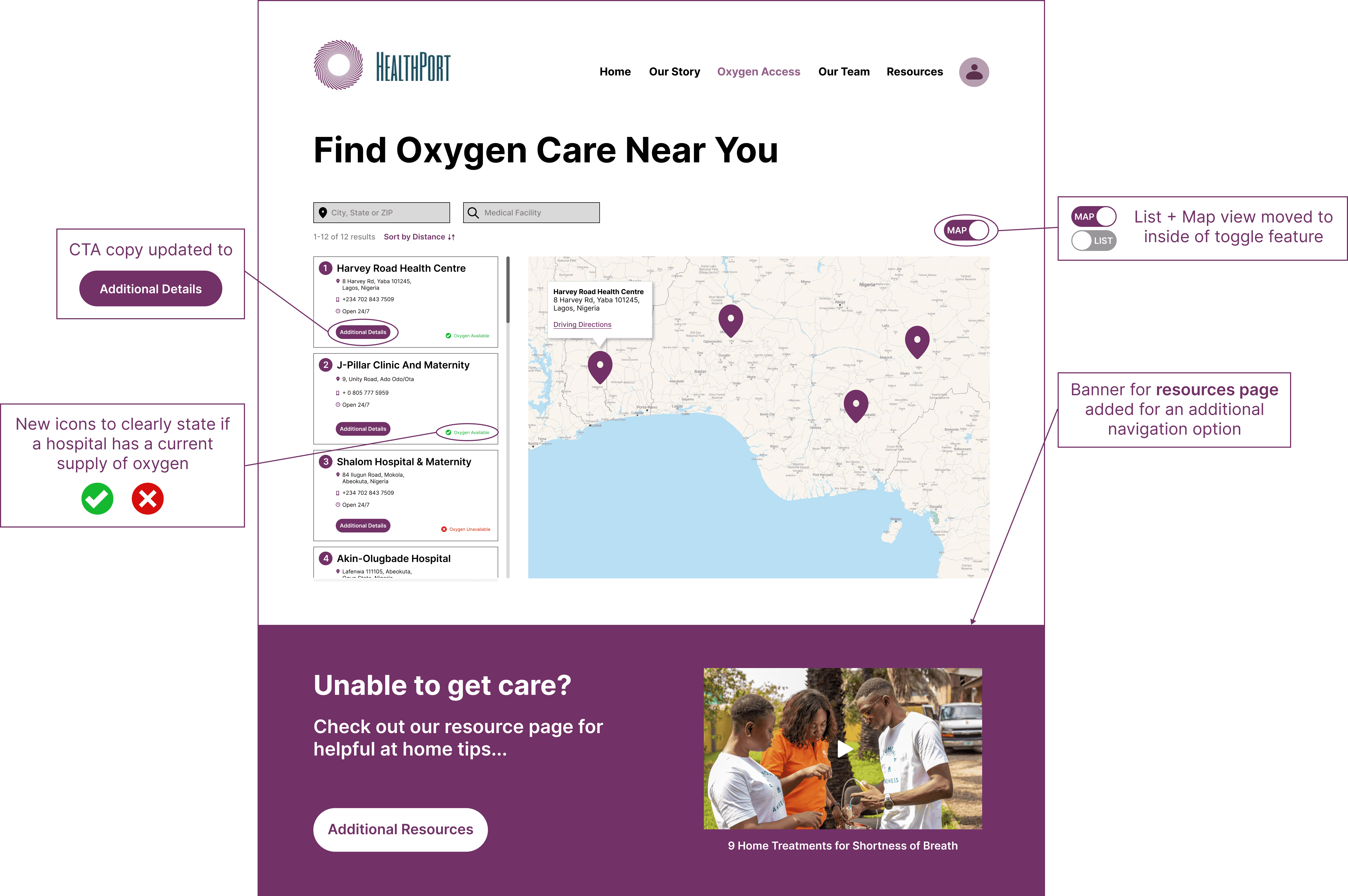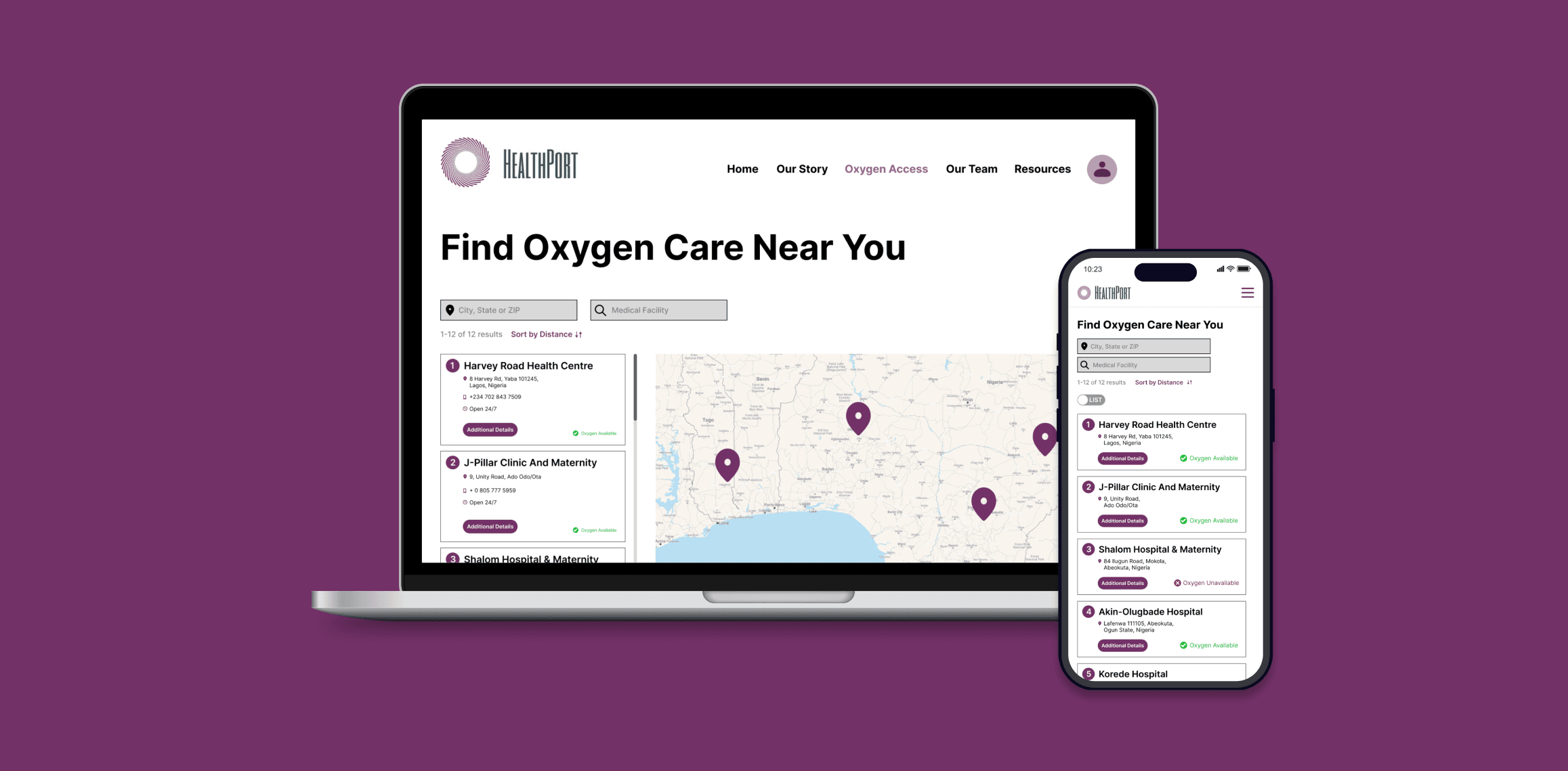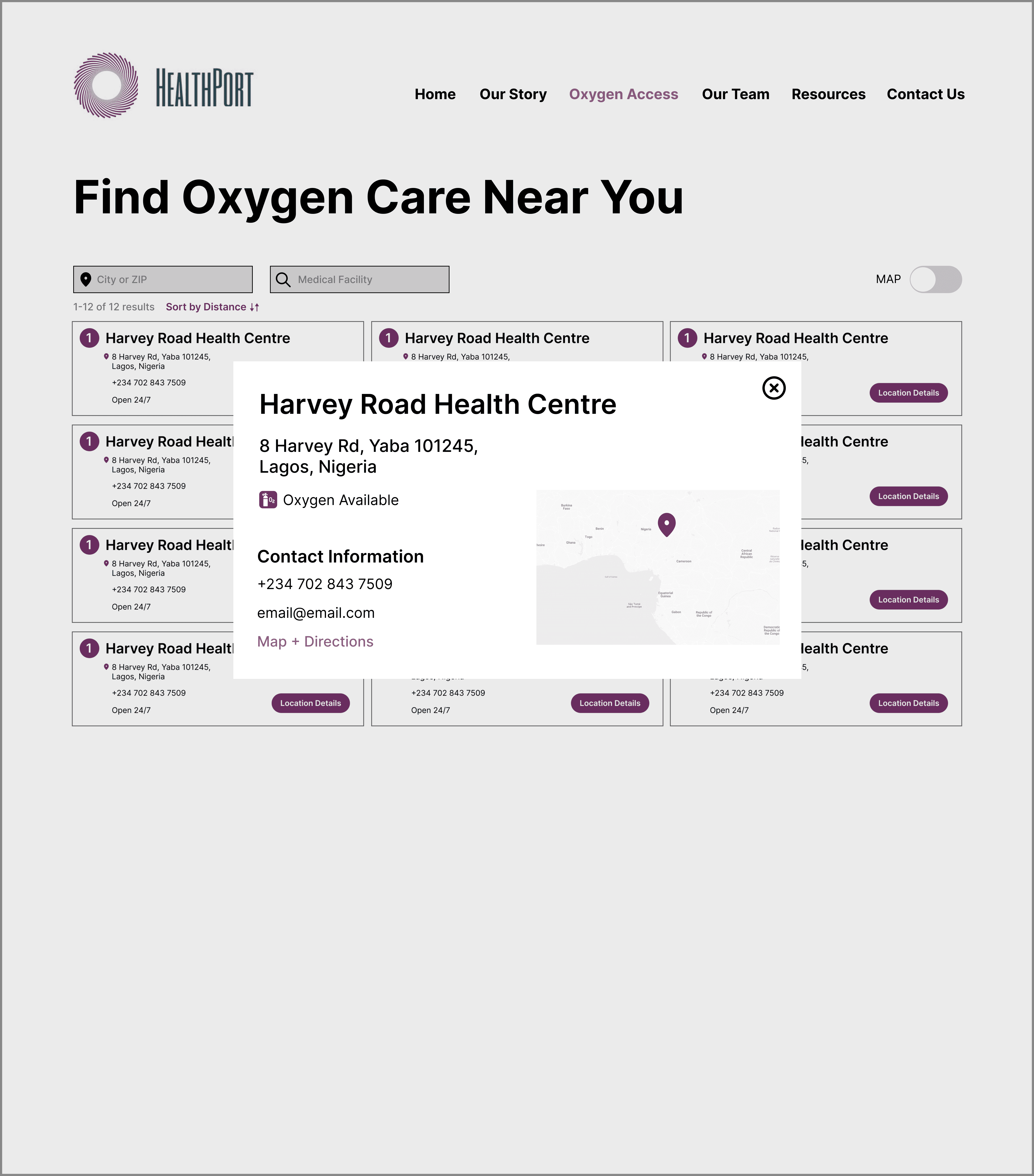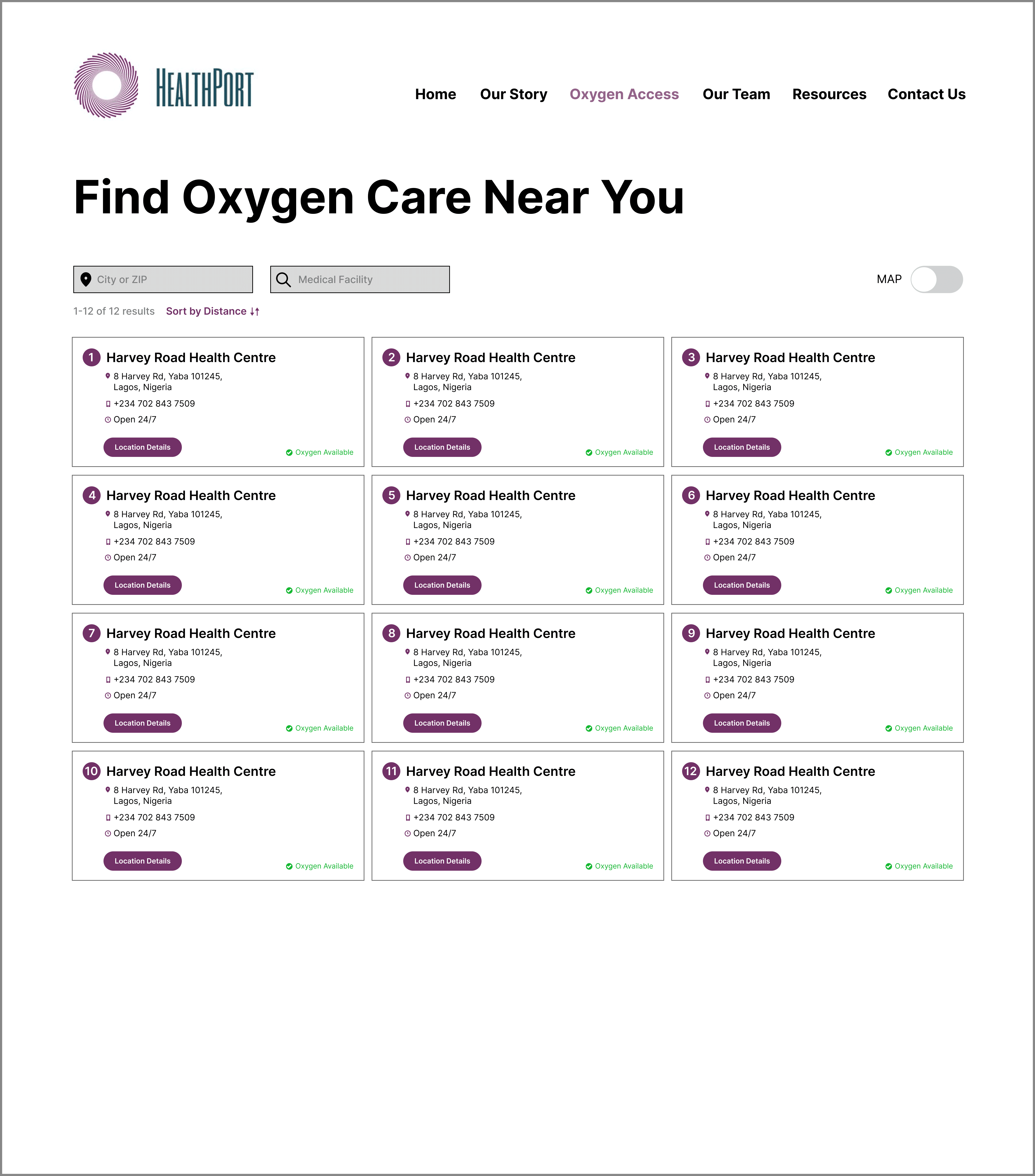HealthPort needs a dashboard that provides users with information and filtering options to find the facility closest to them with the medical assistance and devices they need.