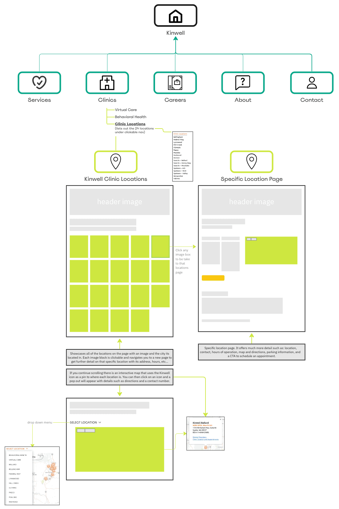Additionally, I created a site flow of the Kinwell Health location dashboard to better understand what goes into creating a successful and user-friendly dashboard.
